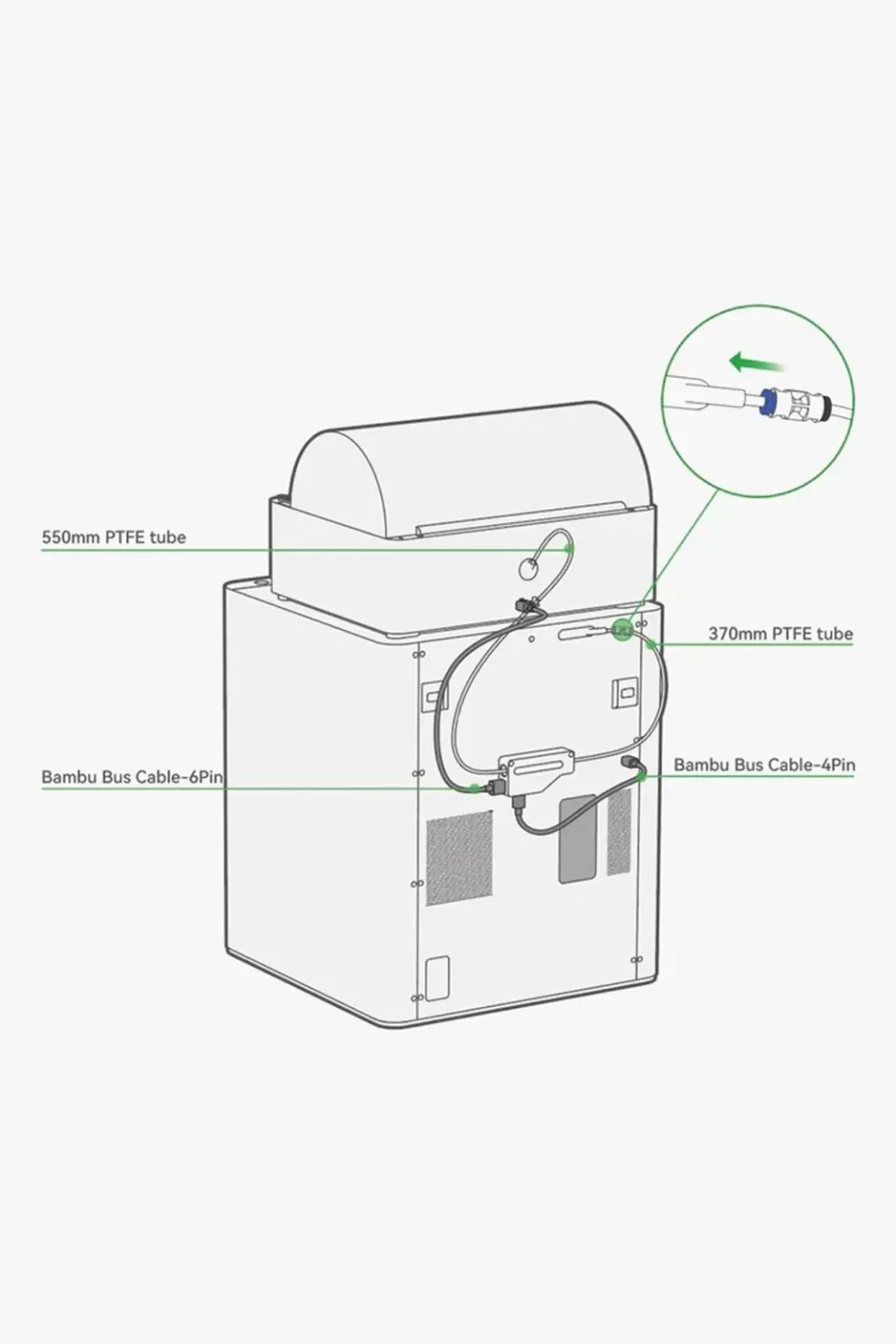 • Filament tamponu, tek bir AMS ünitesiyle birlikte gerekli olan bir aksesuardır. İşlevi, filament için bir tamponlama etkisi sağlamaktır. Arayüz, 3 mm aralıklı, geçmeli terminal girişli 4 pimli kablo, 3 mm aralıklı, geçmeli terminal çıkışlı 6 pimli kablodur.