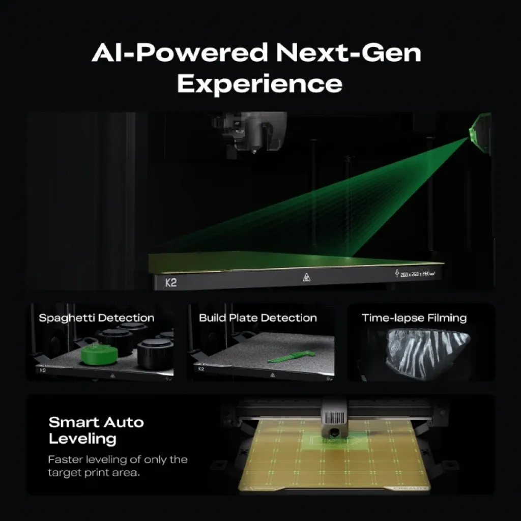 260 x 260 x 260 mm'lik üretim hacmiyle modellerinizi bölmenize veya küçültmenize gerek yok; K2, işlevsel prototipler, cosplay parçaları veya tam boyutlu yaratıcı baskılar için geniş alan sunar.
