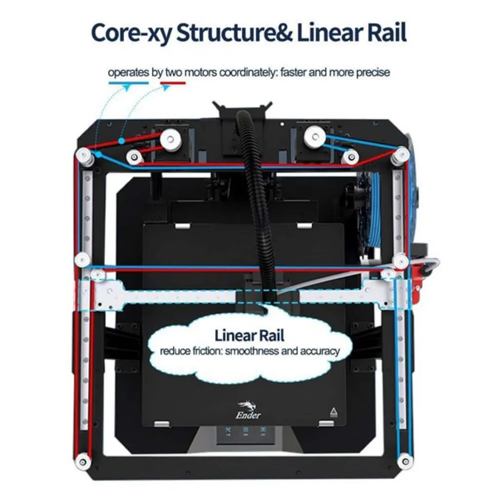Core-XY yapısını kullanan, koordineli operasyonlarla paralel çalışan çift motor, daha hızlı ve daha yüksek hassasiyet