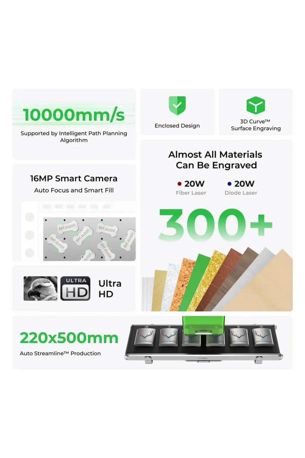 xTool F1 Ultra, sınıfındaki en büyük çalışma alanına sahip olup, 220 mm x 220 mm'lik bir alana sahiptir ve Auto Conveyor (ayrı olarak satılır) eklenerek bu alan 220 mm x 500 mm'ye kadar genişletilebilir. Bu geniş çalışma alanı, büyük projelerin detaylardan ödün vermeden tamamlanmasını sağlar.