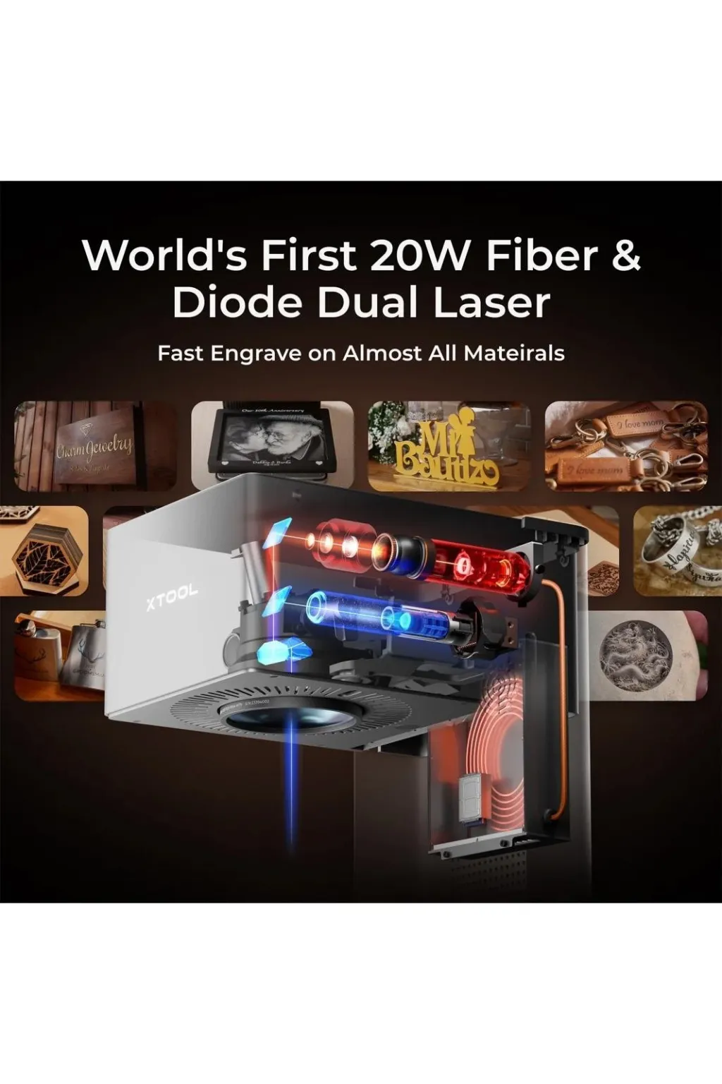 20W fiber ve 20W mavi diyot lazerleri ile donatılan xTool F1 Ultra, geniş bir malzeme yelpazesinde kazıma ve kesim yapabilme yeteneğine sahiptir. Fiber lazer, paslanmaz çelik, alüminyum, altın gibi metallerde mükemmel kazıma yaparken, diyot lazer, ahşap, akrilik, deri, cam, seramik ve kaya gibi yaygın olmayan metal malzemelerde işlem yapabilir.