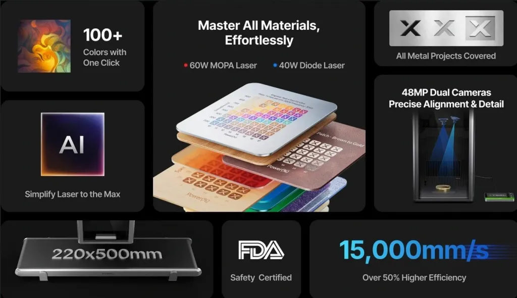 F2 Ultra'nın merkezinde, geleneksel diyot veya CO₂ lazerlere göre üstün performans sunan 60W MOPA (Ana Osilatör Güç Amplifikatörü) lazer modülü yer alır. Bu gelişmiş lazer teknolojisi yalnızca daha hızlı işleme hızları sağlamakla kalmaz, aynı zamanda kullanıcıların paslanmaz çelik ve titanyum gibi metaller üzerinde renkli gravür yapmalarına da olanak tanır; bu, lüks markalama, hediye kişiselleştirme ve endüstriyel parça işaretlemede oldukça aranan bir özelliktir. Işın kalitesi, karmaşık yüzeylerde tutarlılığı korurken karmaşık ayrıntılar ve canlı tonlar elde etmek için idealdir.
